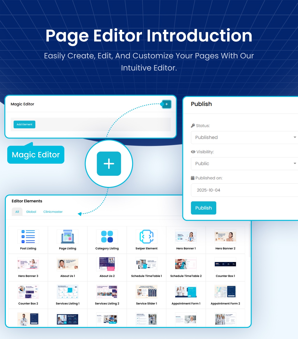 ClinicMaster makes use of the highly effective Aspect Web page Builder built-in inside W3CMS-Laravel, permitting you to create structured medical pages with ease.