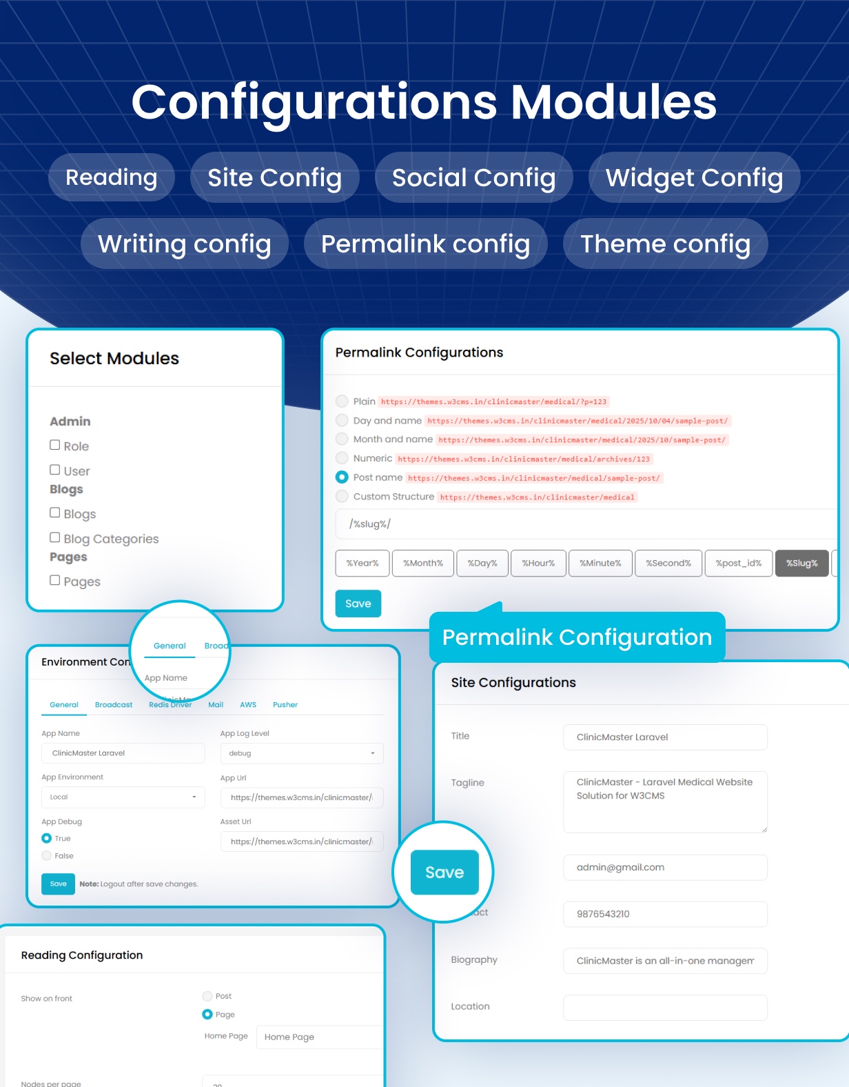 ClinicMaster enhances the W3CMS-Laravel frontend with a elegant medical design whereas maintaining the core CMS totally secure and untouched.