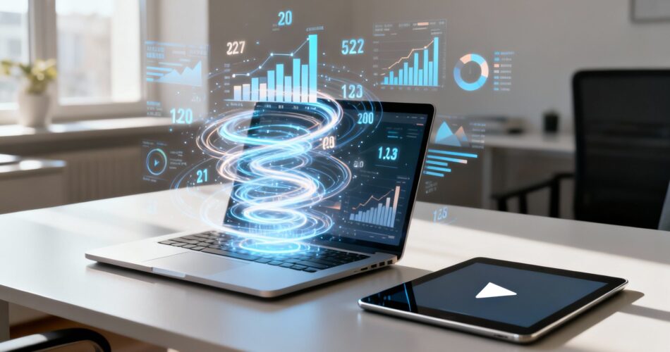 Desktop computer displaying data analytics and a stream of video thumbnails flowing onto a modern desk.