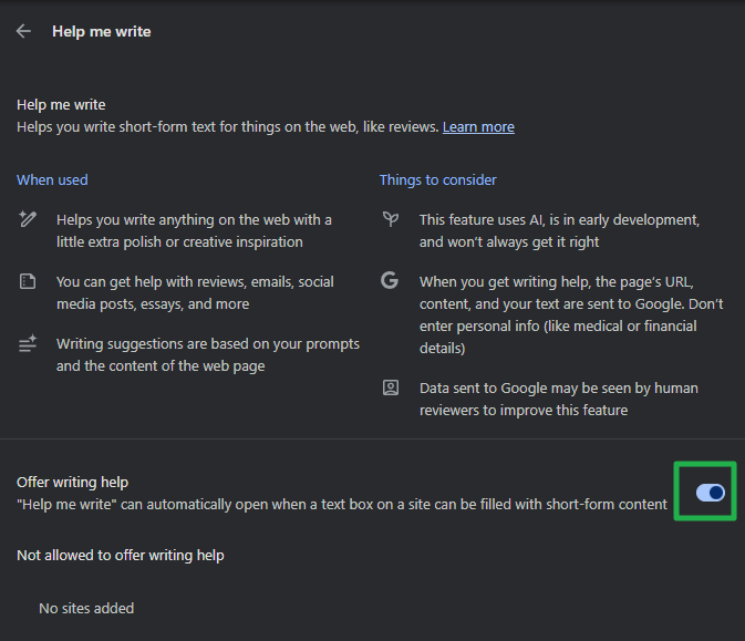 Nevertheless, generally I’ve additionally had the browser pop up a message attempting to encourage me to make use of “Assist me write” whereas I used to be typing right into a textual content discipline, although I’ve not seen that habits just lately. You possibly can guarantee that it doesn’t nag you to make use of “Assist me write” by navigating to chrome://settings/ai/helpMeWrite and toggling “Supply writing assist” to off.