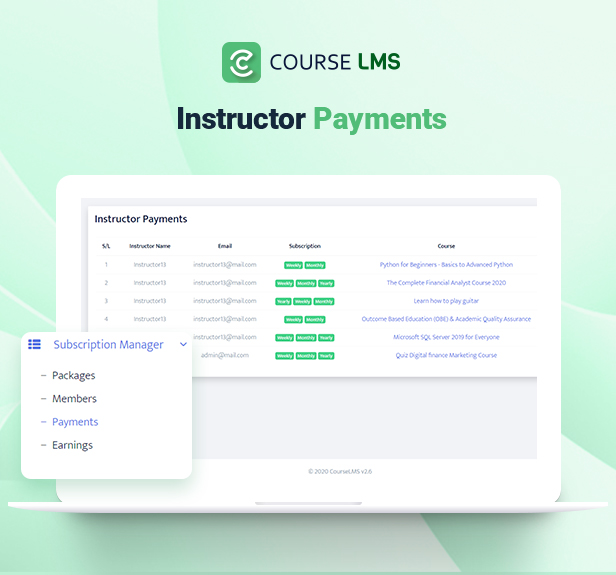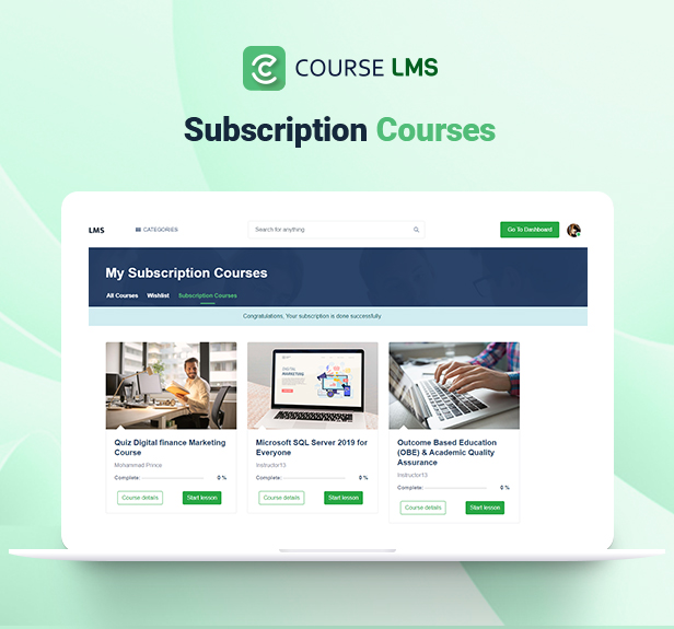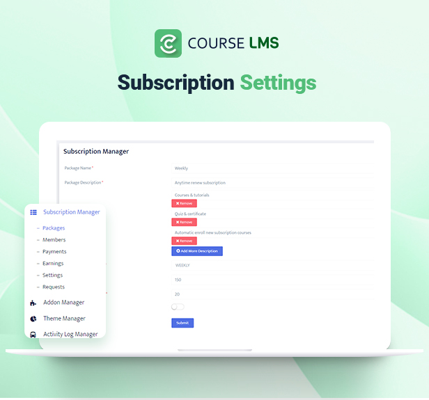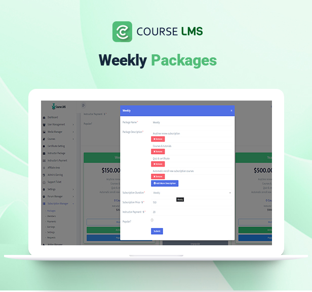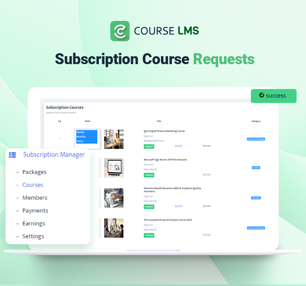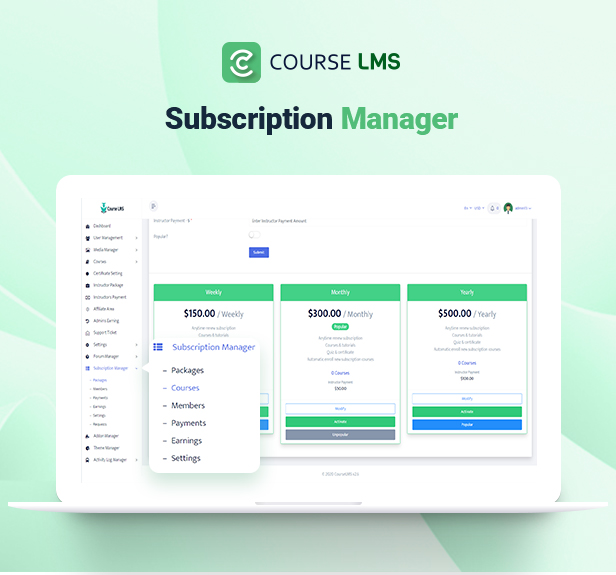 This addon gives college students/membership subscription facility to Course LMS – Learning Management System. By putting in this addon, you’ll be able to add Day by day, Weekly, Month-to-month, Half Yearly, Yearly, Free or trial and any type of subscription package deal. Instructors can ship requests to the admin so as to add his/her course into the Subscription plan. College students can renew their subscriptions plan anytime.