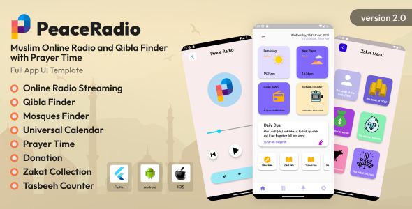 PeaceRadio is a full utility template of Muslim On-line Radio and Qibla Finder with Prayer Time Full App UI Template