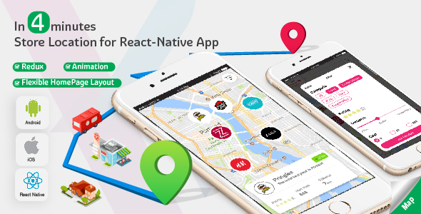Retailer Locator V 1.0 – Full React Native template for iOS and Android.