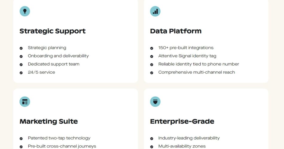 Attentive is an AI-first advertising and marketing software for SMS, RCS, and e mail, with SMS because the core channel. It requires constructing a customized plan from channels to AI characteristic choice and is greatest for mid to massive companies needing advertising and marketing solely.