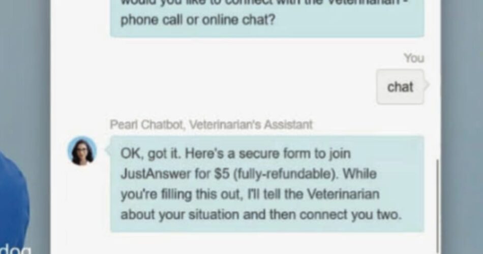 Pearl’s pre-scripted messages adopted a constant sample. After gathering fundamental details about the buyer’s query, Pearl said: “OK, acquired it. This is a safe kind to affix JustAnswer for $5 (fully-refundable). Whilst you’re filling this out, I will inform the Veterinarian about your state of affairs after which join you two.”