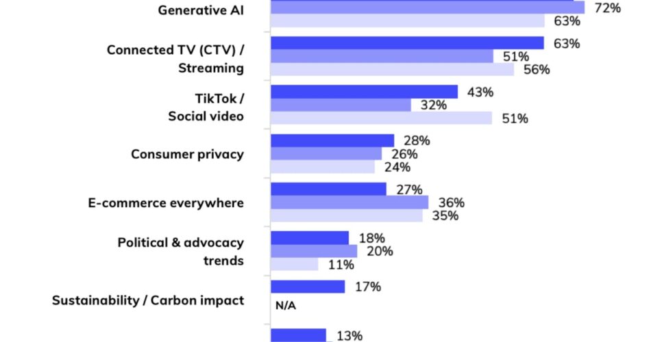 For the third consecutive survey, generative AI remained a very powerful shopper development that entrepreneurs are monitoring. The expertise captured 70% of respondents, although this represented a slight decline from the earlier report. Regardless of the minor dip, generative AI continues to dominate marketer consideration, reflecting the expertise’s increasing function in on a regular basis shopper habits from search and discovery to content material creation and problem-solving.