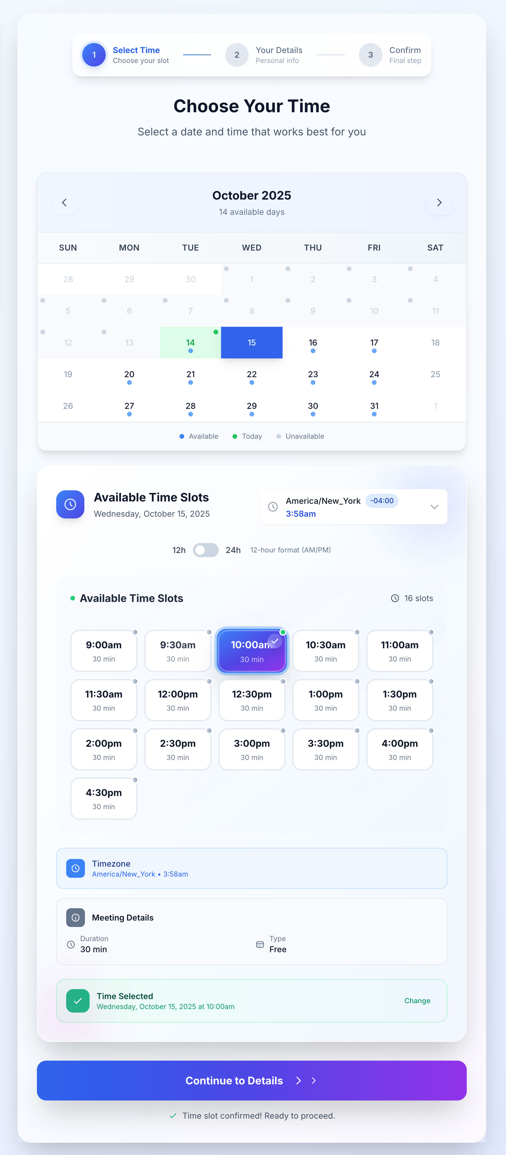 - Automated Timezone Conversion: The reserving calendar routinely detects and handles timezones for each you and your shoppers, eliminating confusion and no-shows.