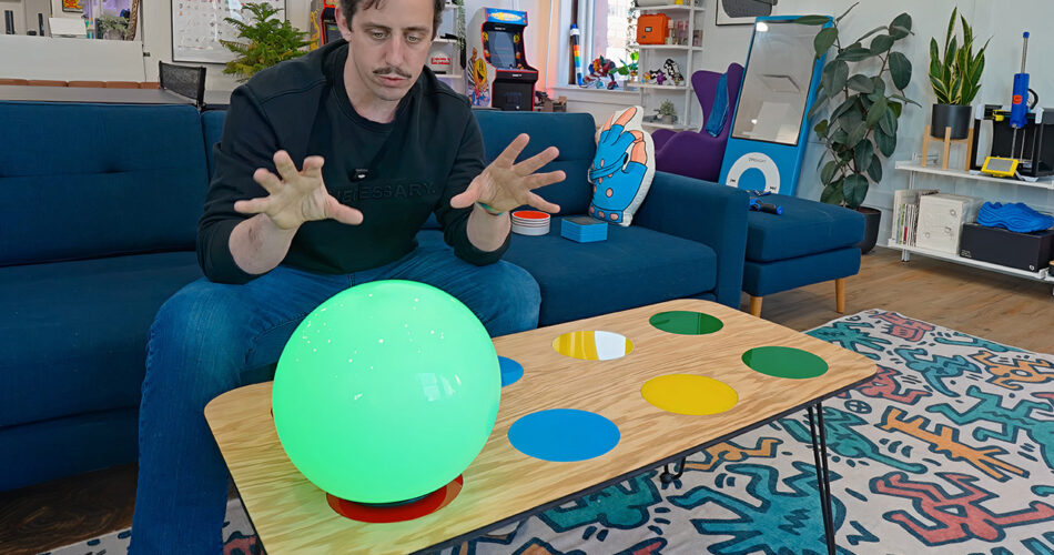 One of many equipment he created is a lamp produced from an previous IKEA glass lampshade. The circuits that function the RGB LEDs are situated within the lamp’s base. Put the lamp on a purple dot and it’ll mild up deep crimson; transfer it to a blue dot for a cool blue glow; or place it on a yellow dot for a nice delicate amber mild. Different areas produce distinct results, equivalent to delayed respiration, fast flashing, and even biking rainbows. And as quickly as you decide up the lamp from a dot, it merely goes out.