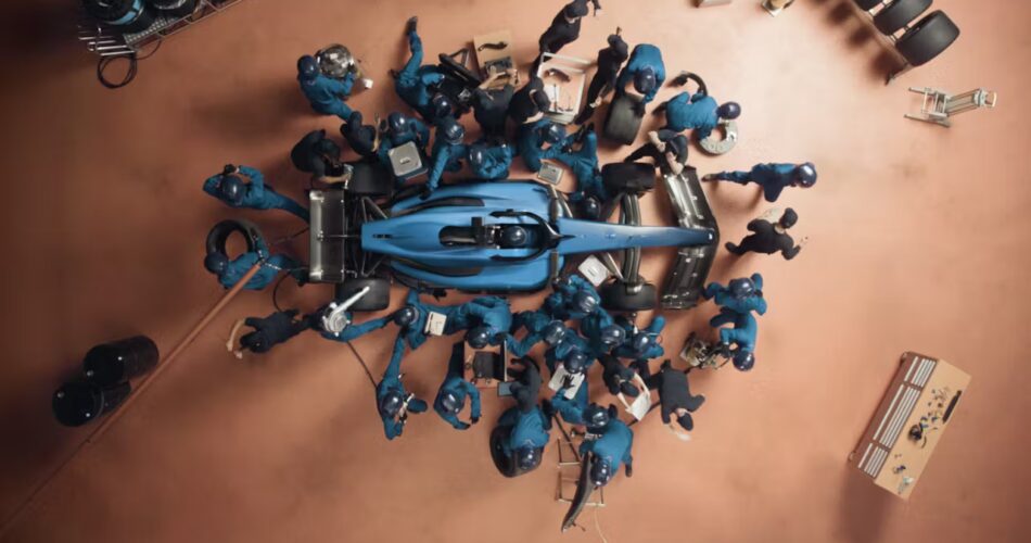 Titled ‘Considering Formations,’ the movie unfolds in a single, steady shot, opening shut contained in the Atlassian Williams F1 Group storage earlier than slowly pulling again to an overhead view. In sluggish movement, 42 performers transfer in direction of the automobile with the choreographed precision of a pit crew.