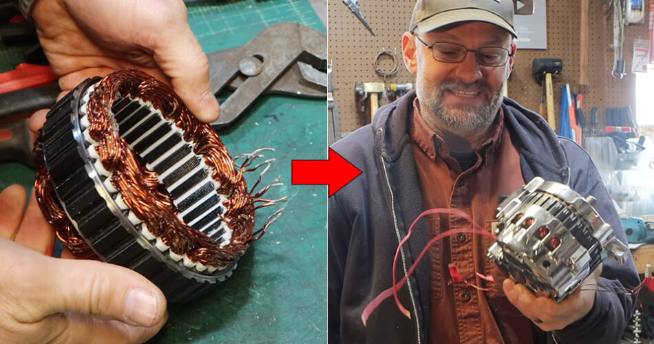 Most traditional alternators have three-phase AC inside them, however earlier than it’s transformed to DC, a rectifier contained in the alternator is utilized, and a regulator maintains the voltage at a managed degree, roughly 14 volts. We’re left with a naked three-phase generator with all different elements eliminated. The rotor stays as an electromagnet with all elements powered by a small DC provide. When the rotation begins, a present flows by the stator windings. In most alternators, thick wire with a small variety of turns per coil is utilized to create numerous present with low voltage, however John has chosen to make use of the alternative.