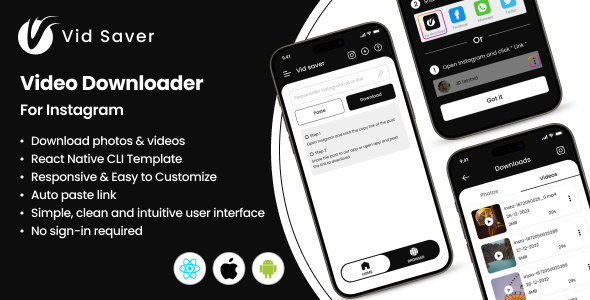 VidSaver is a complete React Native CLI template designed for builders aiming to create a top-tier Instagram video downloading app. With high-quality video downloads, seamless media administration, and user-friendly capabilities, this strong template aids builders in constructing cross-platform apps for each Android and iOS. That includes functionalities like photograph downloads, story saving, VidSaver ensures an entire and fascinating Instagram content material administration expertise. This template affords a safe and intuitive platform for creating refined Instagram video downloader functions with ease.