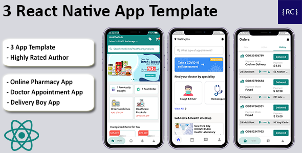 Physician Appointment Reserving App + On-line Pharmacy App + Supply Boy App Template in React Native(Expo) | 3 App Template