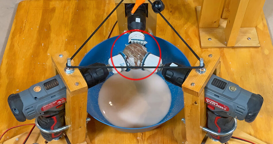 The whole course of begins with rocks you’ve collected off the coast, after which the three grinding bits, gently pressed in a cup form across the rock, start to show, inflicting the rock to slowly tumble in place as they grind away the bits that protrude too far. After roughly two hours, the lumpy form begins to resemble a sphere. Initially, the merchandise would simply pop free in a single piece, so Rob needed to make some modifications, like shortening the bits, growing the strain, and swapping the bits from previous to new, till every thing made sense.