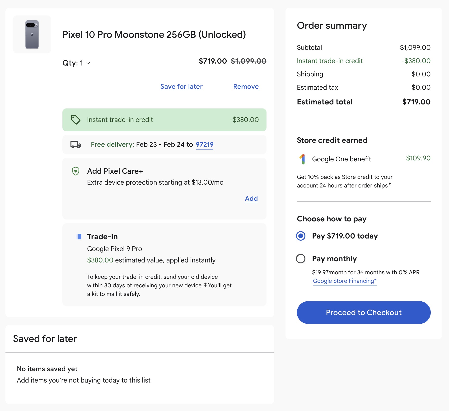 Beneath, you’ll be able to see a checkout web page the place I informed Google I had a Pixel 8a to commerce they usually wish to give me a $215 low cost for it. With that utilized, I might pay simply $284 immediately for a Pixel 10a with 128GB storage.