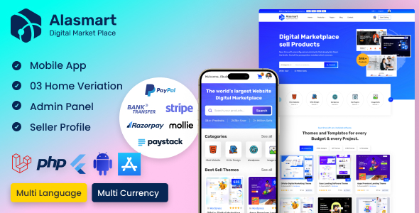 Alasmart – Digital Merchandise Purchase Promote Market App with Admin Panel is greatest match for any enterprise who’s attempting to promoting scripts, themes, plugins, print, graphics, cell app, software program, audio information, movies, music, digital artwork, templates, images and many others