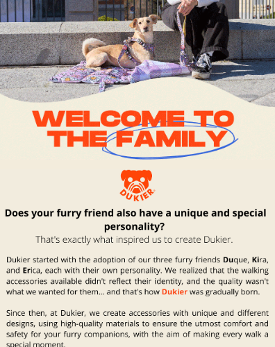 Shopify marketing automation: Three smiling people and three dogs sit together on grass in a park. Text reads “Welcome to the Family” and introduces Dukier, a brand focused on unique, comfy dog accessories. Orange highlights accent the message and offer a discount.