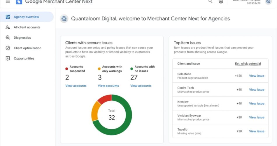 The diagnostics web page goes deeper. It surfaces particular issues throughout all shopper accounts concurrently and permits filtering by shopper, nation, or advertising and marketing methodology. Critically, it introduces a metric referred to as “click on potential” – an estimate of what number of further clicks may very well be recovered by resolving a given challenge. This isn’t a brand new idea inside Service provider Middle; earlier coverage of Merchant Center’s AI-powered search filters from Might 2025 famous that click on potential was already getting used on the product degree to assist retailers prioritize fixes. Service provider Middle for Companies extends that logic to the company tier, enabling groups to rank points throughout their total portfolio by estimated site visitors influence fairly than treating all warnings as equal.
