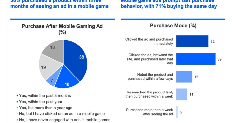 The acquisition habits knowledge is probably the most commercially concrete factor of the research. In response to the Kantar report, 38 % of respondents mentioned they’d bought a product inside three months of seeing an commercial in a cellular recreation. Amongst these consumers, 71 % mentioned the acquisition occurred the identical day. Breaking that down additional: 32 % clicked the advert and bought instantly, whereas 39 % clicked the advert, browsed the positioning, and accomplished the acquisition later that very same day.