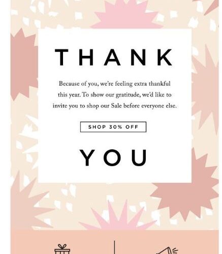 Loeffler Randall makes use of this thanks for your small business template, providing clients early entry to its sale with a 30% off as a token of appreciation: