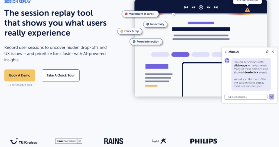 Due to Mouseflow’s new AI agent, Mina, you don’t need to wade by means of a bunch of session recordings and watch each second of every one to search out the insights you want. Simply ask Mina to indicate you what it is advisable to know—did anybody rage click on on my signup web page?, for instance, or Which areas of my web site see the least interactions?