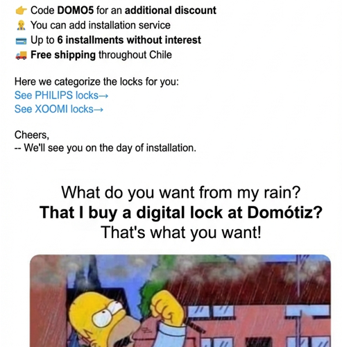 Weirdest emails: A promotional email for digital locks features rain and slipper emojis, a discount code, product links, and a Simpsons meme of Homer pressing a I want the discounts button, emphasizing convenience in bad weather.