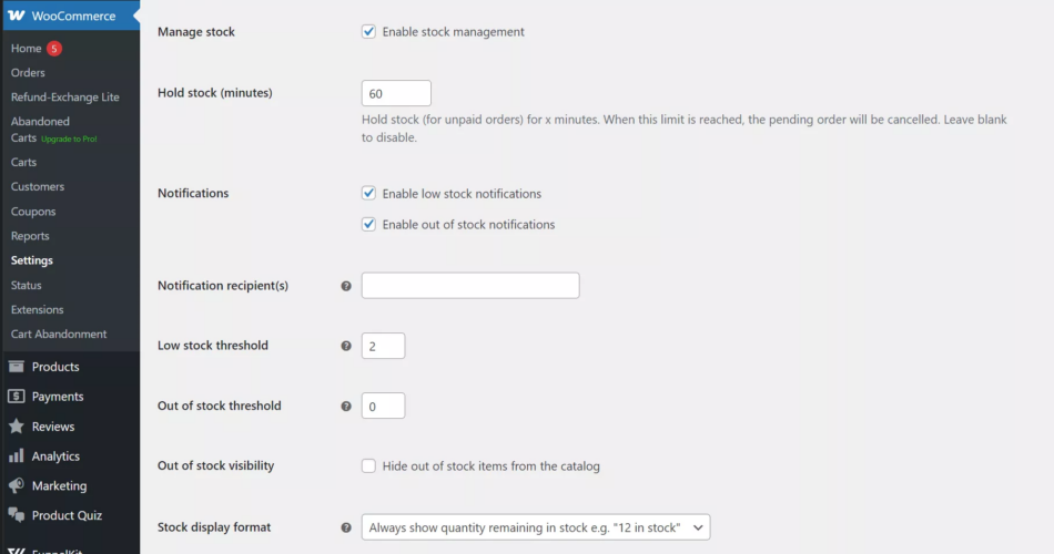 1. Go to WooCommerce > Settings > Merchandise > Stock