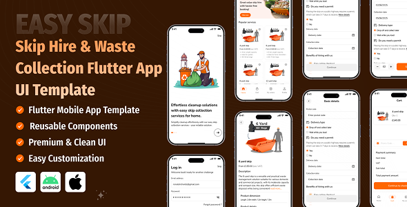 EasySkip is a premium Flutter UI Equipment constructed for skip rent, waste assortment, and on-demand disposal companies. With 50+ superbly designed cell screens, EasySkip delivers an entire buyer journey — browse skip sizes, verify availability by postcode, schedule supply & assortment, handle bookings, apply coupon codes, view order historical past, and talk with help.