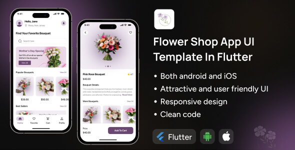 • Entry to the Flutter Flower store App UI Template Code.
