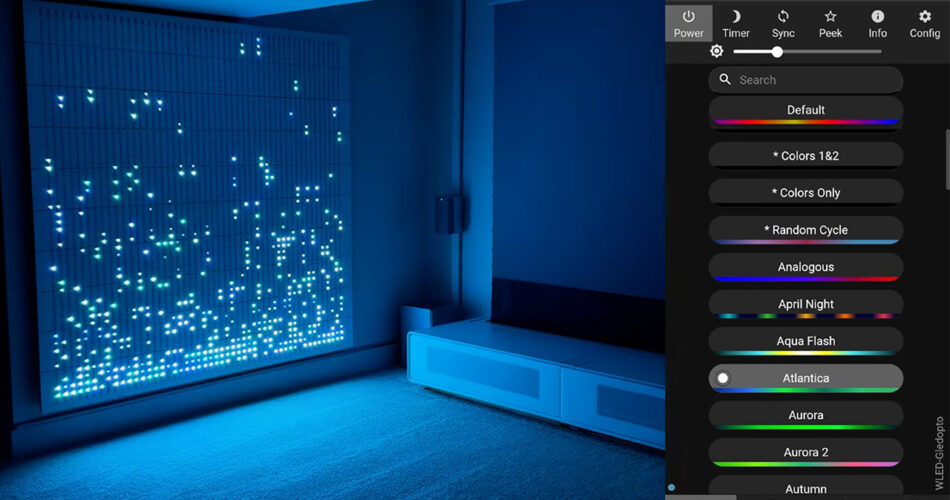 The wiring was reasonably easy, as you simply join the voltage, floor, and information wires in that order. He utilized coloured wire markers to maintain monitor of which was which throughout meeting. The controller and energy provide have been mounted to the again with easy clips and wood blocks. A French cleat system on the again makes it easy to mount the entire panel to a wall. As soon as he had the whole lot configured contained in the WLED interface, it was solely a matter of choosing the SK6812 sort, validating the 12-volt system, and specifying the 50×50 sample with a vertical zig-zag orientation. Some brightness limitations have been set to guard the ability provide, and 4 information outputs have been allotted to every block of LEDs. As soon as the whole lot was saved, the show would reply promptly to requests for colours, results, or scrolling messages.