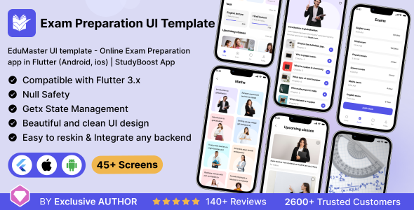EduMaster app UI Template is a modern, fashionable app template designed for Examination Preparation App. Constructed utilizing the Flutter 3.x framework, this template is totally customisable and might create stunning and intuitive apps for Android and iOS platforms.