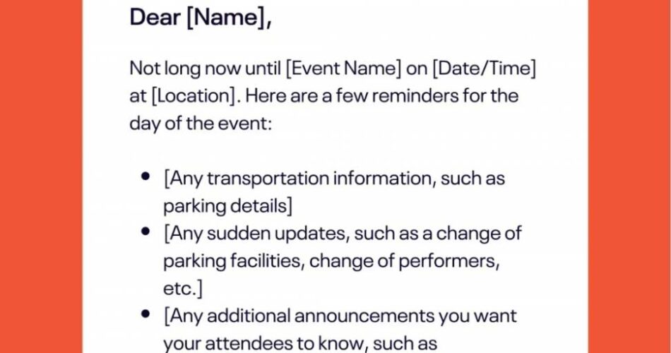 This reminder needs to be quick and simple to scan. Embody a hyperlink to the venue map, a fast parking reminder, and a contact quantity. This helps attendees arrive easily and on time.