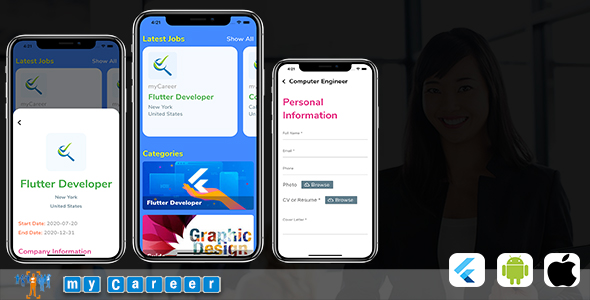 myCareer is a whole flutter software template for iOS and Android (Flutter) which helps to view jobs from job portal web site utilizing REST API, and likewise apply for the job immediately from the app.