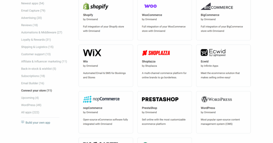 Omnisend has 11 native retailer integrations, together with Shopify, WooCommerce, Wix, BigCommerce, Ecwid, and Shoplazza: